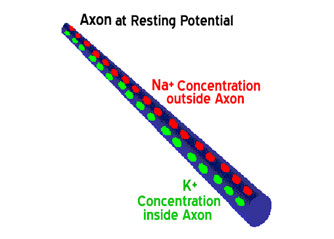 When an action potential begins, the channels that allow crossing of the Na+ ions open up. When the Na+ channels open, the depolarization occurs, the Na+ rushes in because both of the greater concentration of Na+ on the outside and the more positive voltage on the outside of the axon. The flow of positively charged ions into the axon leads the axon to become positively charged relative to the outside. With each positively charged Na+ ion that enters the axon, another positive charge is inside and one fewer negative charge is outside the axon. Thus, together the inside grows increasingly more positive and the relative concentration of Na+ inside the axon relative to outside the axon grows greater. This initial phase of the action potential is called the depolarization phase. Now as the depolarization phase progresses, the status of the two physical forces that have been discussed changes. At the end of the depolarization phase, the voltage of the inside of the axon relative to the outside is positive and the relative concentration of Na+ ions inside the axon is greater than at the beginning of the action potential. The inside of the axon becomes sufficiently positive, about +30 mV as an average value, the Na+ channels close. This closing of the Na+ channels will greatly limit the ability of Na+ ions to enter the axon. In addition to the Na+ channels closing, the potassium (K+) channels open. Now K+ ions are free to cross the channels and now leave the axon due both to the greater concentration of K+ on the inside and the reversed voltage levels. The action potential is therefore not the movement of voltage or ions but the flow of these ion channels opening and closing moving down the axon.