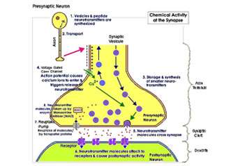 The exchange of the sodium (NA+) and potassium (K+) ions then triggers exocytosis of neurotransmitters via synaptic vesicles. These neurotransmitters diffuse into the synaptic gap. Once this process has occurred, the cell depolarizes back to its previous level of –70mV.